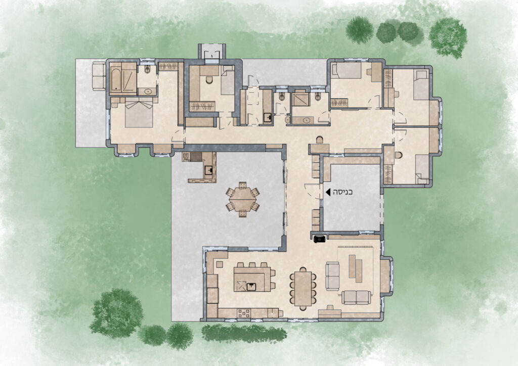 בחרנו לתכנן בית בצורת ח׳ שיאפשר לכל חדר לקבל את החוץ.