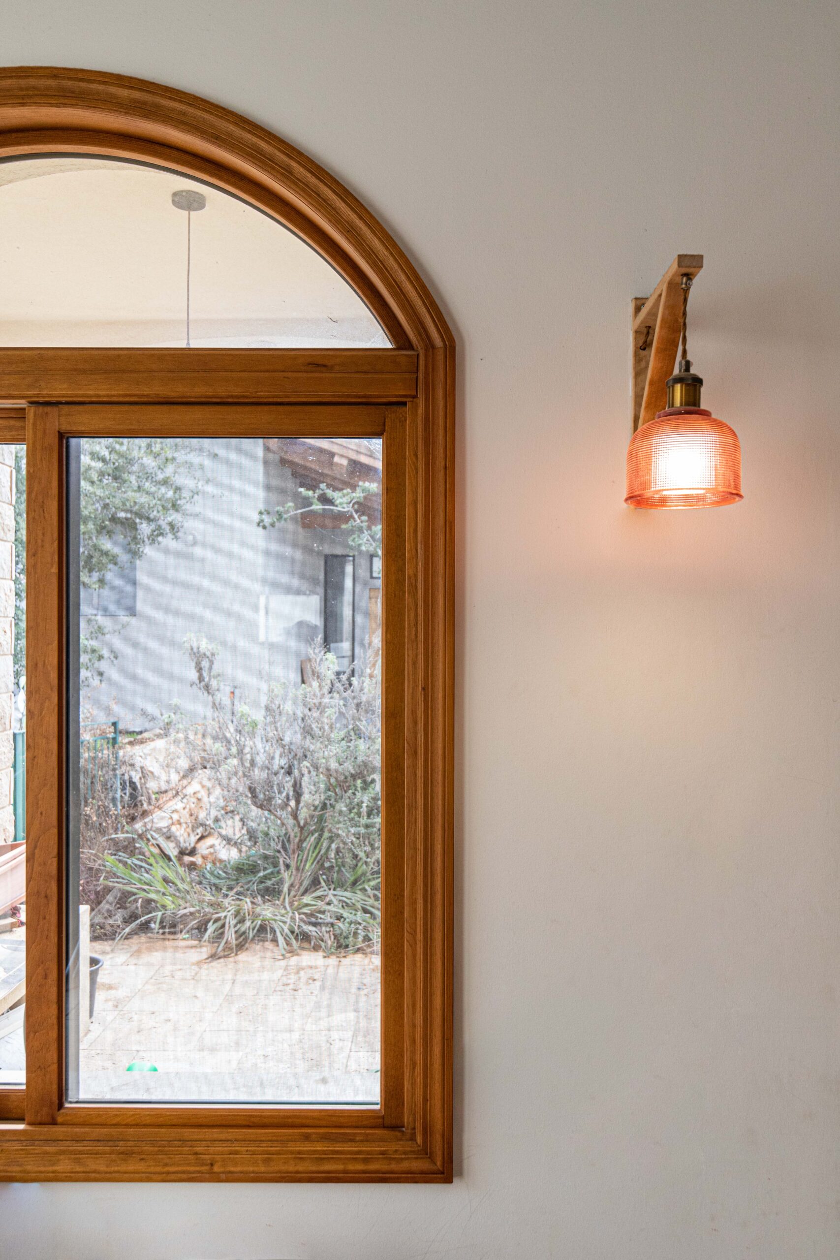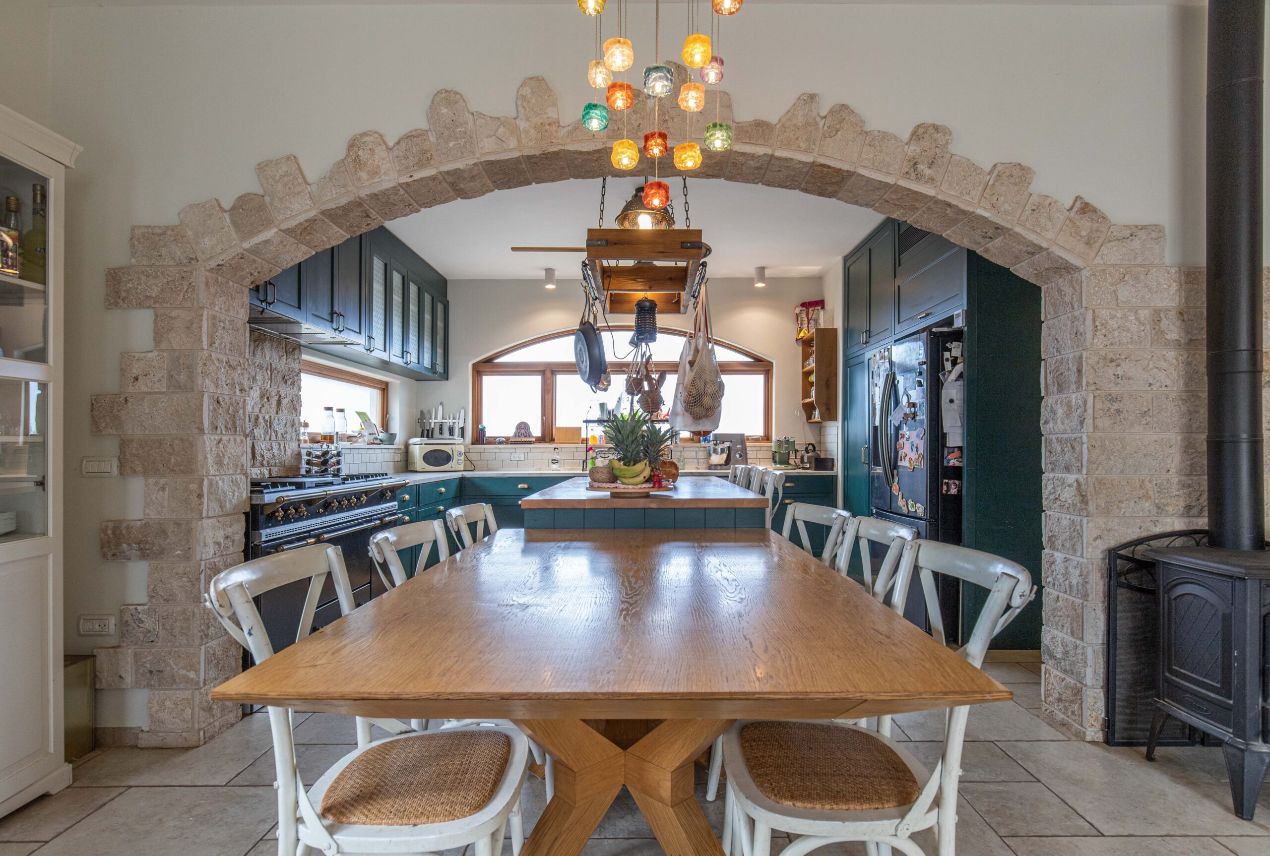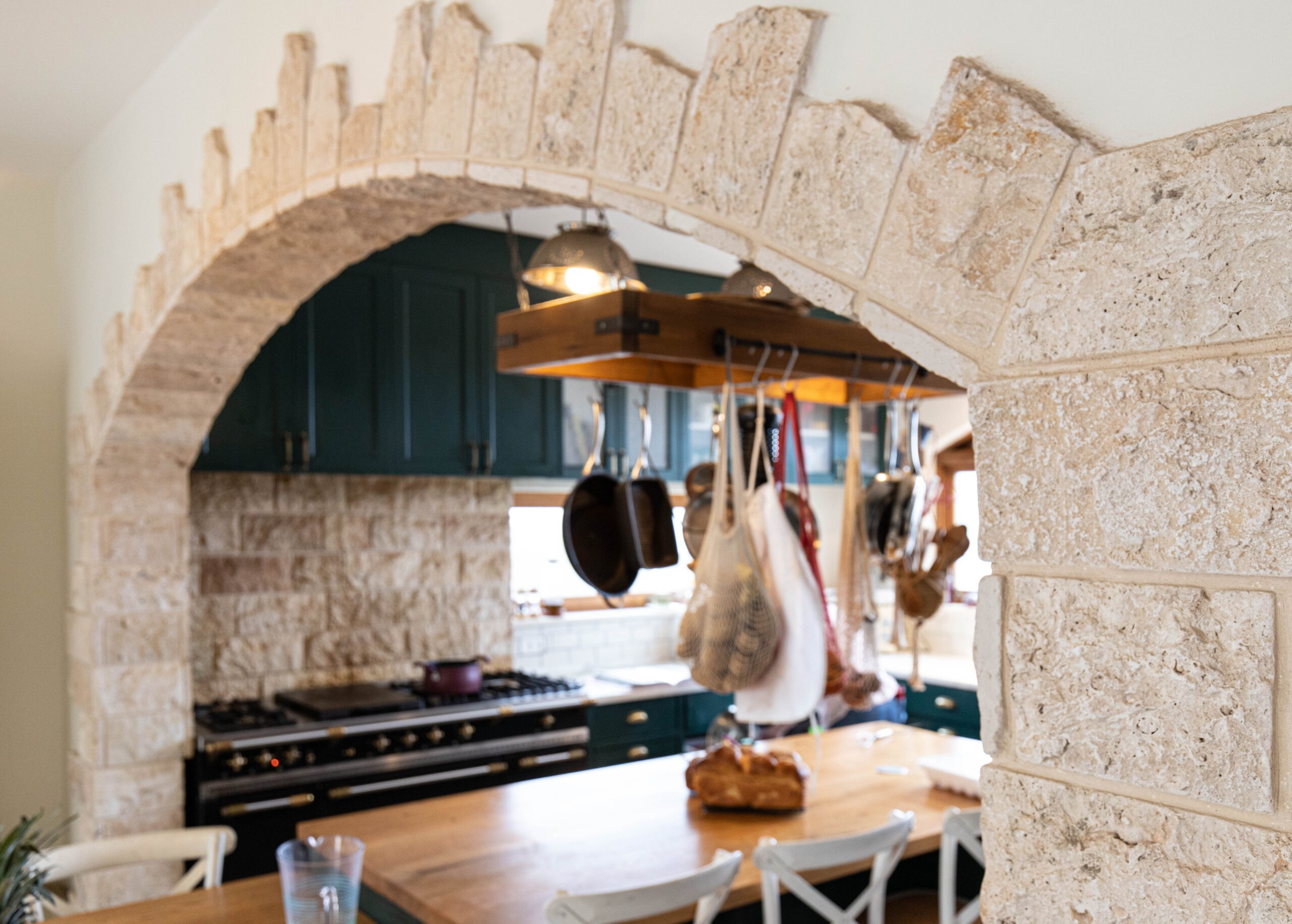האבן הטבעית מופיעה בקירות החיצוניים של הבית ובפנים באזור המטבח, שם בני הזוג רצו ליצור קשת רחבה החובקת את המטבח ומוסיפה אוירה ים-תיכונית לתוך עיצוב הבית.