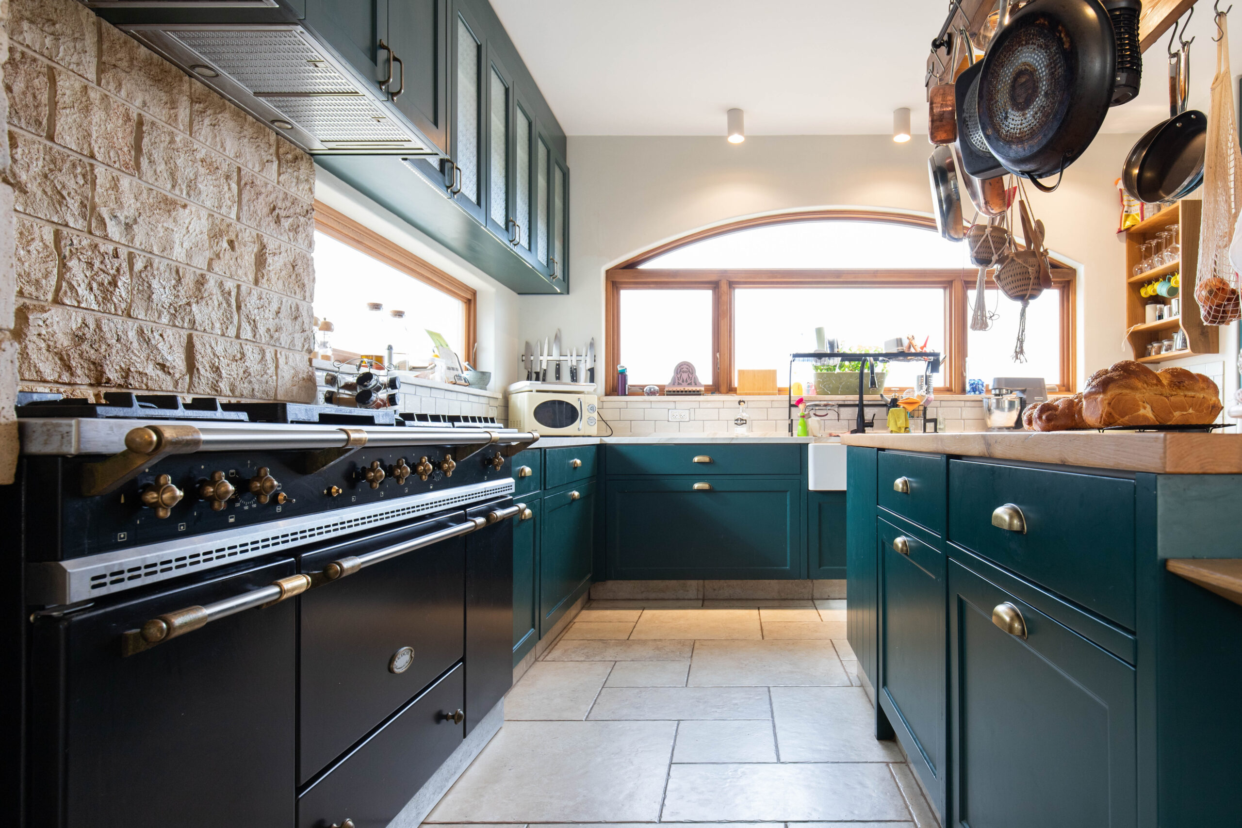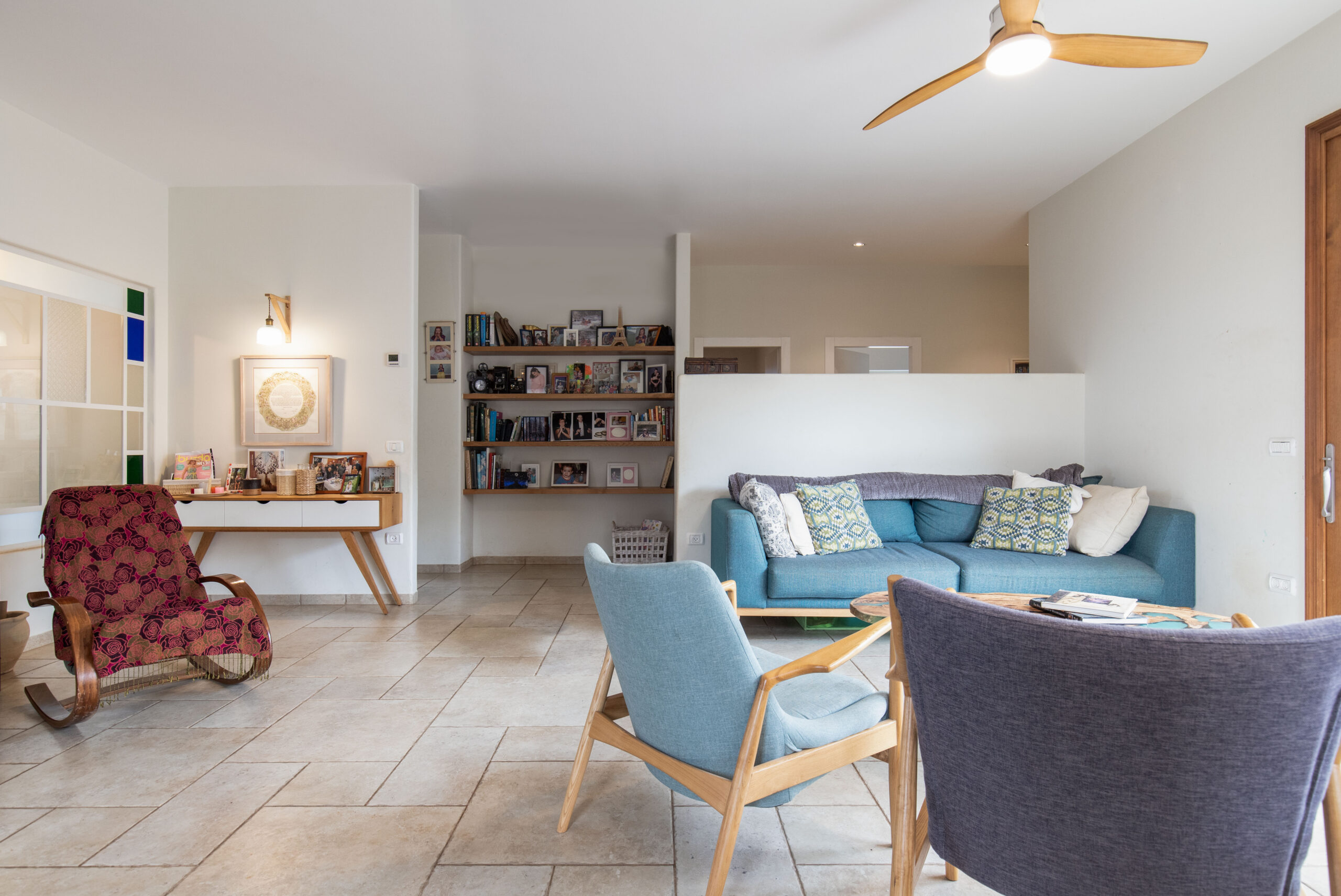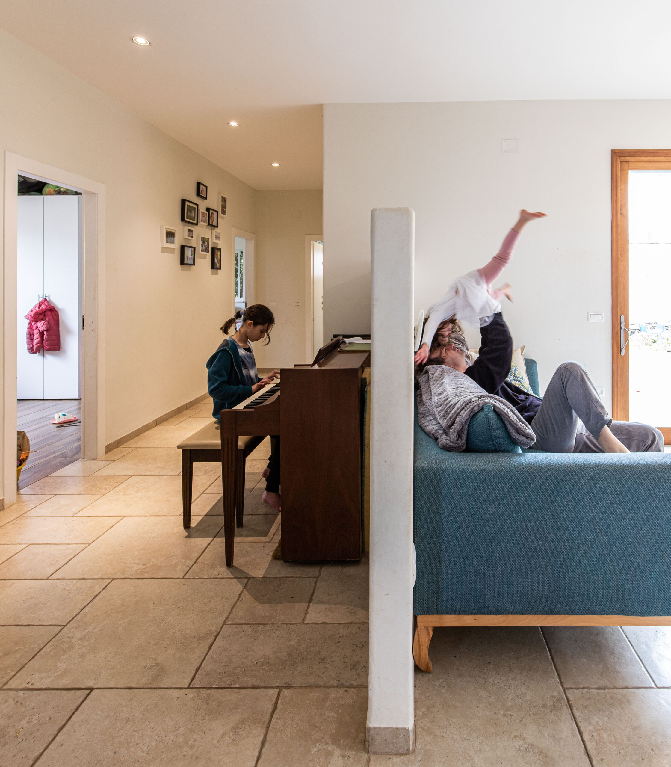 האבן הטבעית מופיעה בקירות החיצוניים של הבית ובפנים באזור המטבח, שם בני הזוג רצו ליצור קשת רחבה החובקת את המטבח ומוסיפה אוירה ים-תיכונית לתוך עיצוב הבית.