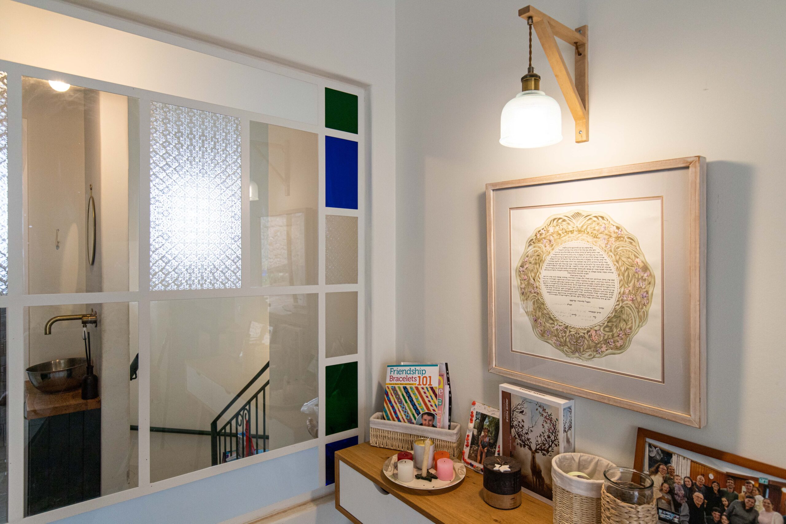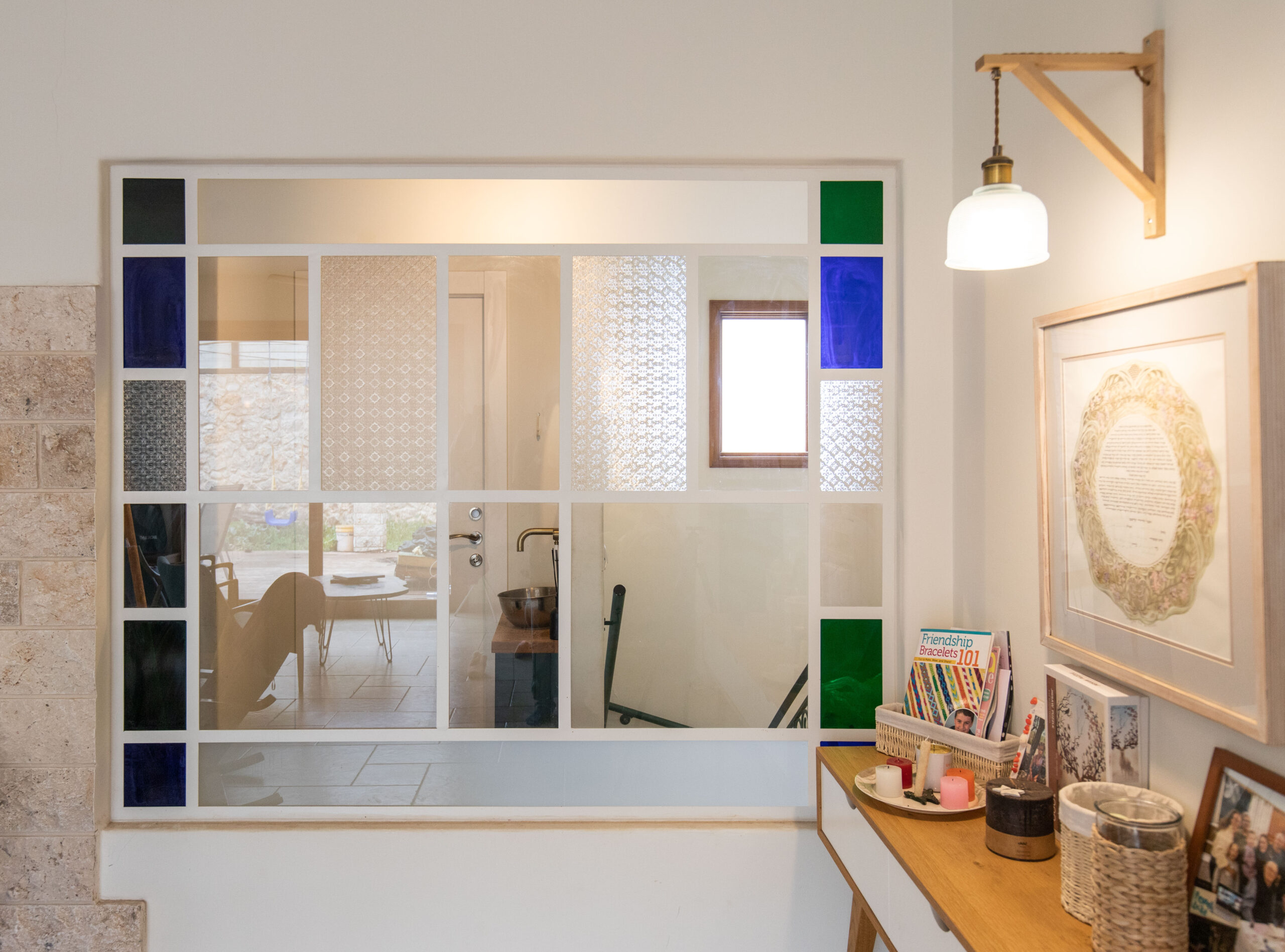 המעבר מוביל לשירותי אורחים צדדים לקומה ומעבר למפלס התחתון, חלון ויטראז׳ בהזמנה אישית הותקן בקיר המעבר, הדבר משאיר קשר עין עם הכניסה לבית וראיה של מי שנכנס ועם זאת משאיר תמונה יפה ודקורטיבית.