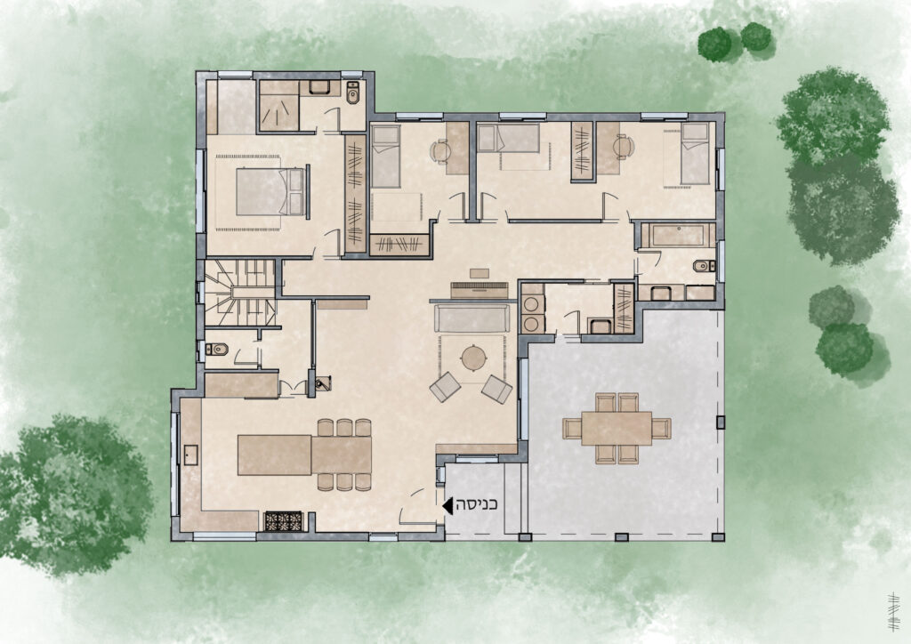 ההשראה העיצובית לבית הייתה בתי אבן אירופאי ולכן ניתן לראות את האבן הטבעית בכל פינות הבית. משביל הכניסה המוביל למפלס העליון של הבית שעוצב כשביל עיזים, עם מדרגות אבן רחבות וארוכות בכדי לייצר הליכה טבעית, קלה ונוחה יותר.